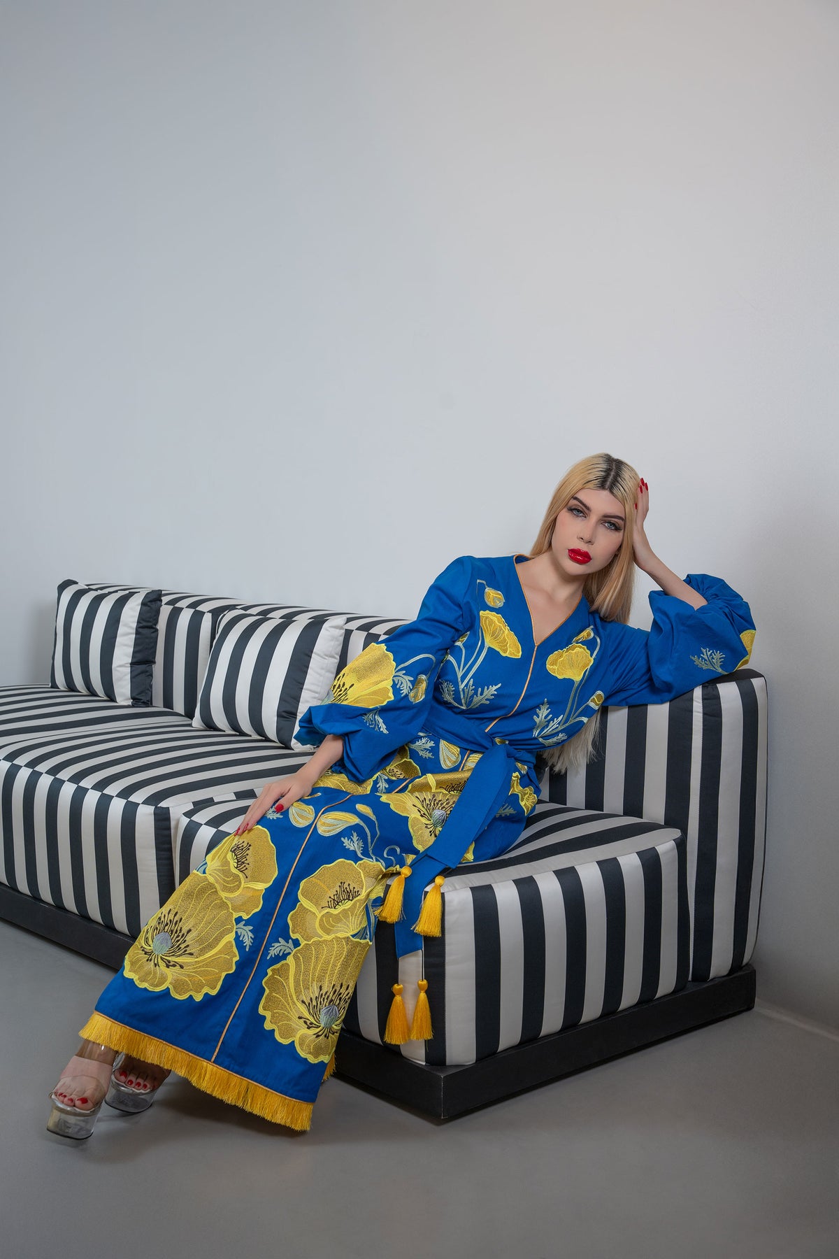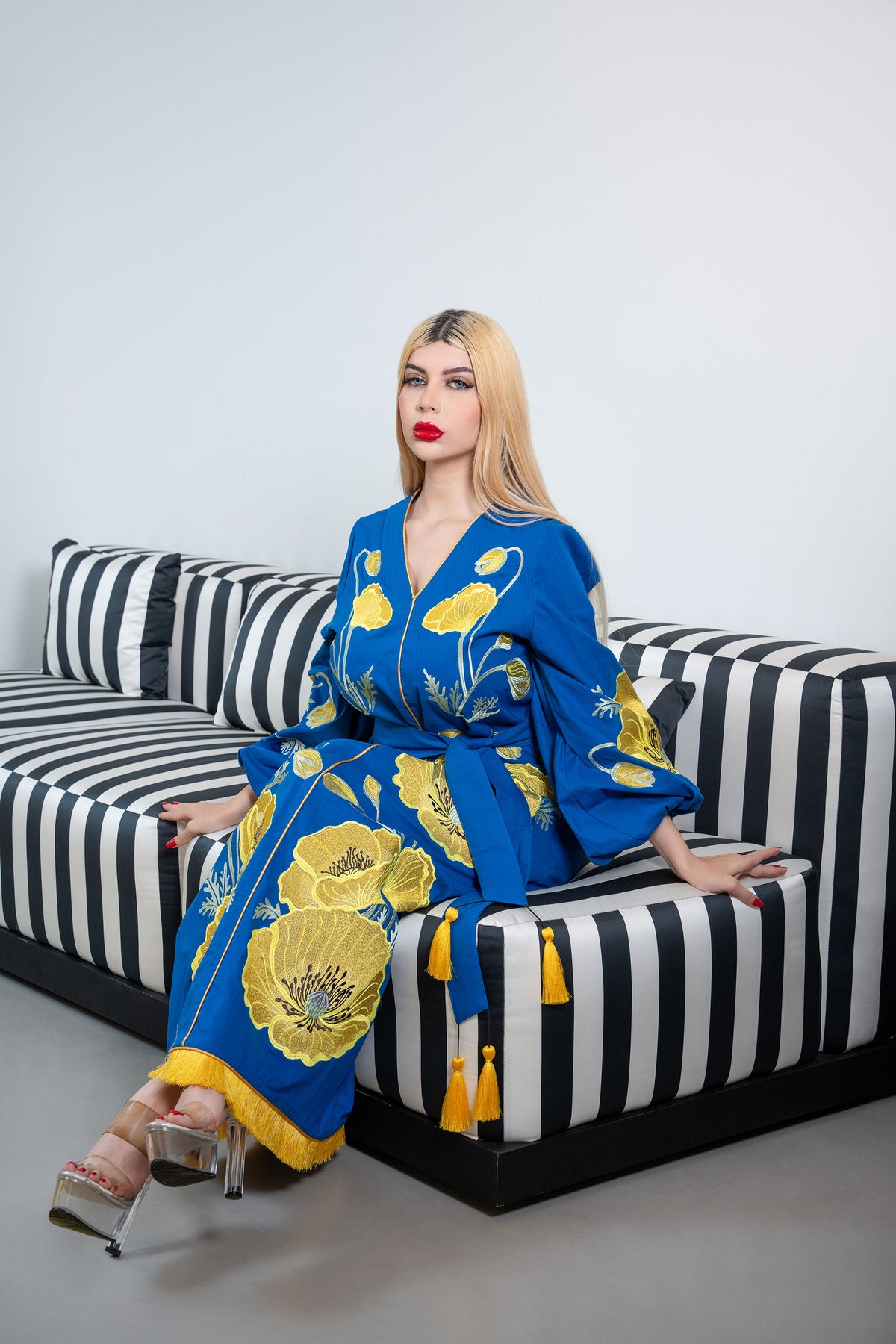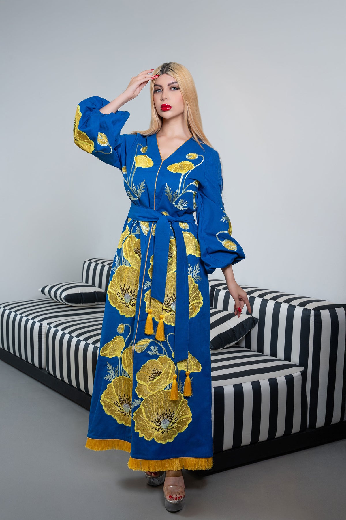 Embroidered Maxi Kaftan with Tassel Belt – AZURE