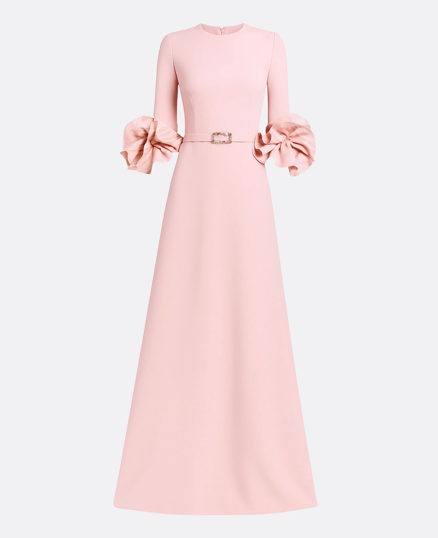 A soft blush pink gown with elegant long sleeves, cinched waistline, and dramatic oversized floral cuffs. The flowing A-line silhouette and jeweled belt detail add a romantic finish, perfect for weddings, galas, or refined evening occasions.