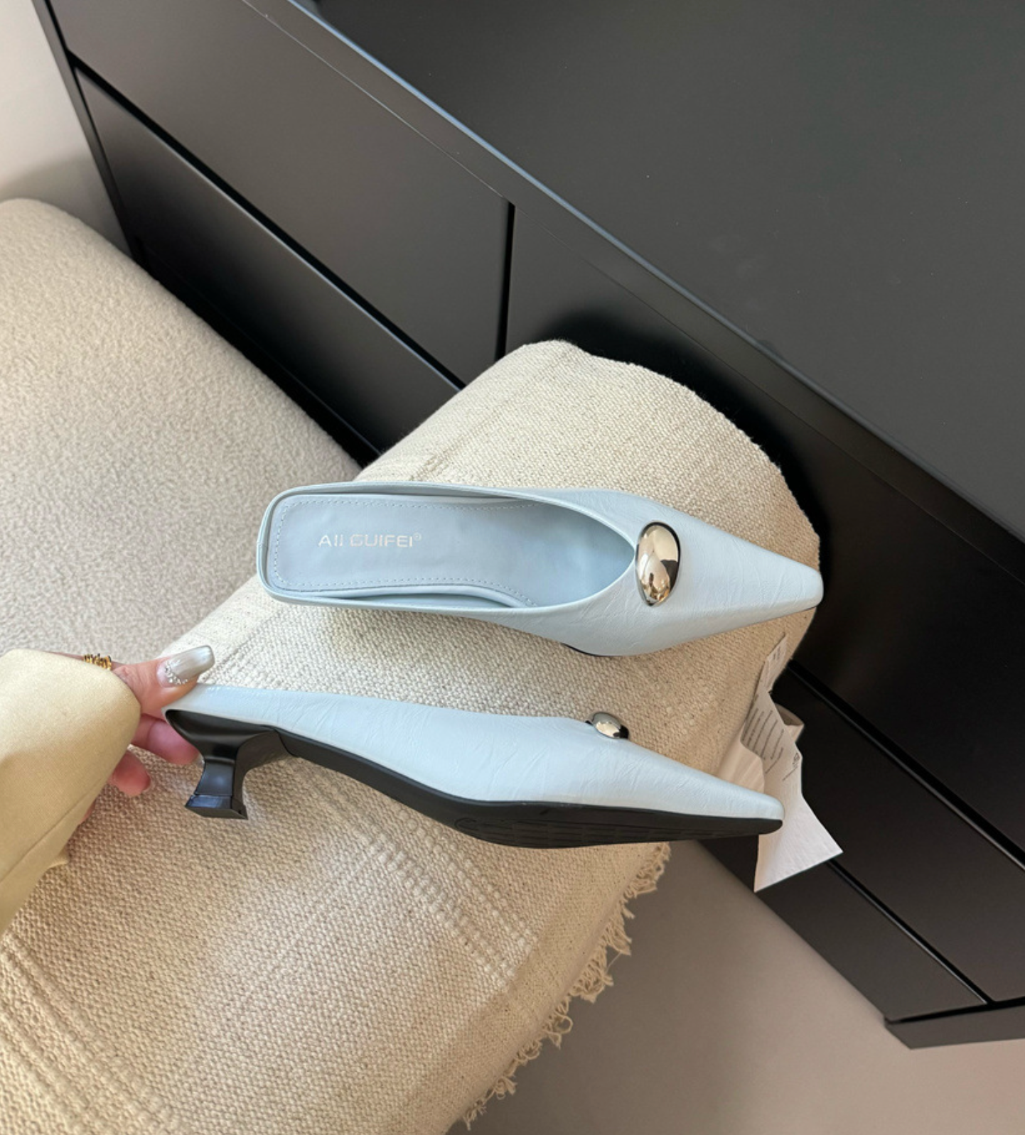 Diese elegante und anspruchsvolle Pumps mit spitzer Zehenpartie sind aus glänzendem schwarzem Lackleder gefertigt für einen polierten Look. signature feature—ein weicher grauer Pelzbesatz an der Vorderseite—verleiht diesem klassischen Design einen luxuriösen Touch. Entworfen mit einem schlanken hohen Absatz und einem weichen goldfarbenen Futter, kombiniert dieser unverwechselbare Schuh mühelos Eleganz und Raffinesse, sei es für Abendgarderobe oder gehobene Anlässe.