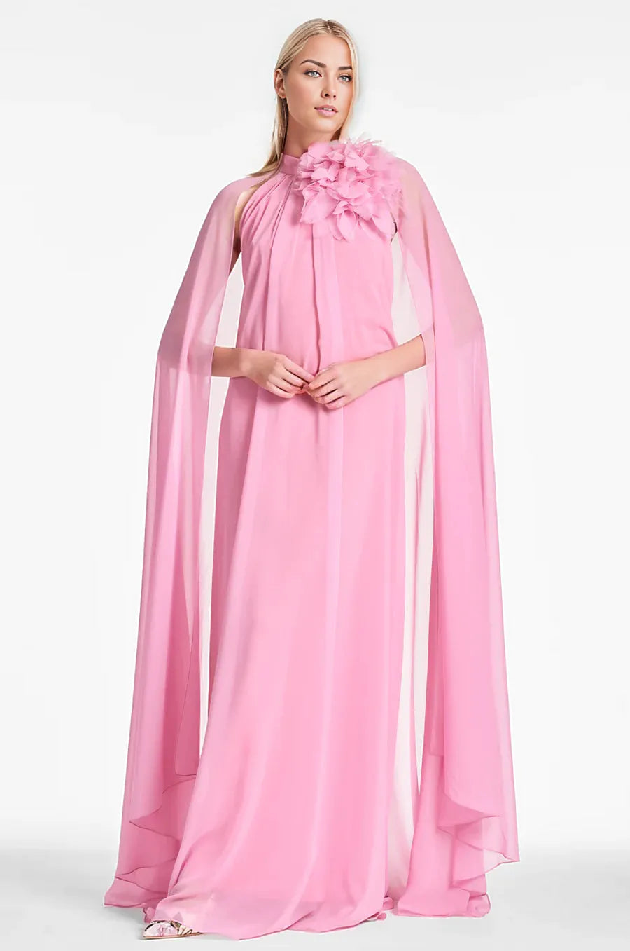 Flowing blush pink cape gown featuring a halter neckline adorned with layered floral appliqués, exuding romance and ethereal elegance for statement evening wear.