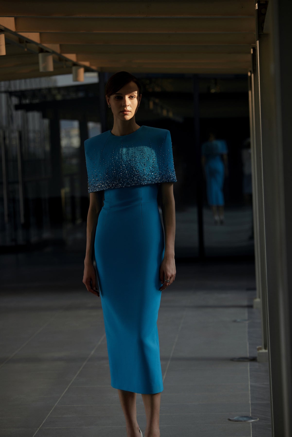 A striking azure midi dress with a sculpted silhouette, elevated by a structured cape overlay adorned with shimmering crystal embellishments—sleek, modern, and effortlessly glamorous.