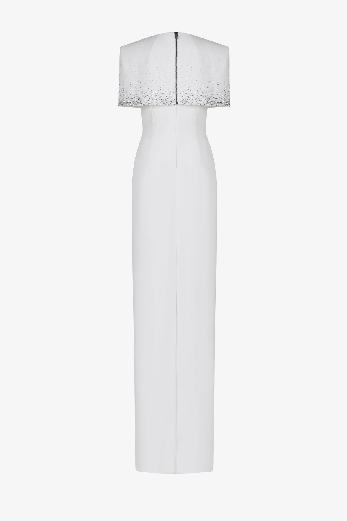A refined white column gown featuring a sleek silhouette adorned with a crystal-embellished cape overlay—an ethereal balance of minimalism and modern glamour.