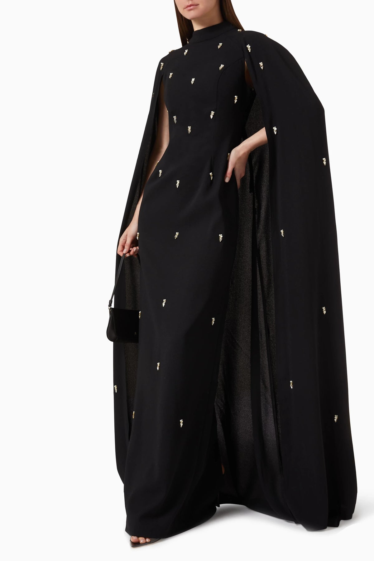 A sophisticated black gown with a floor-length cape, adorned with scattered crystal embellishments for subtle sparkle. The high neckline and sleek silhouette make it an elegant choice for evening galas and refined occasions.