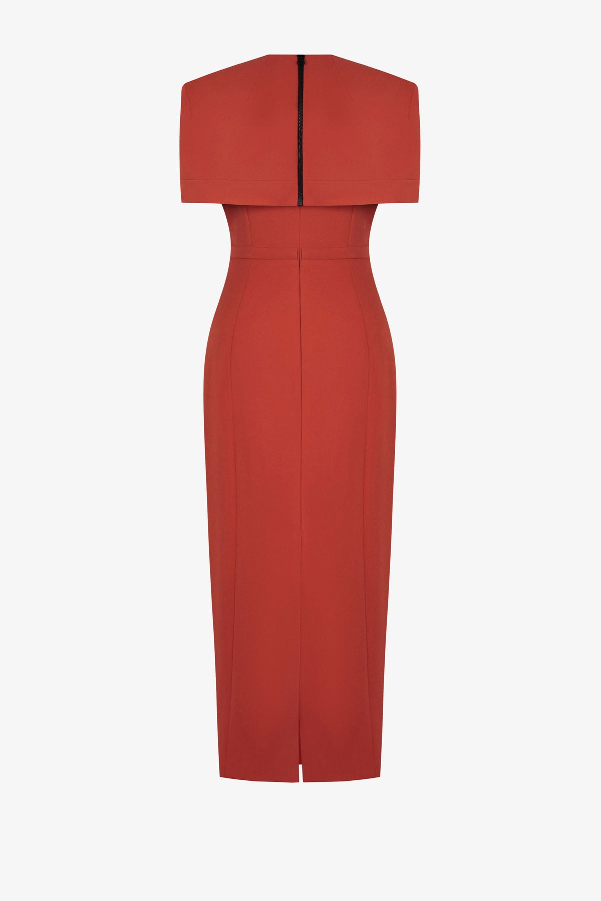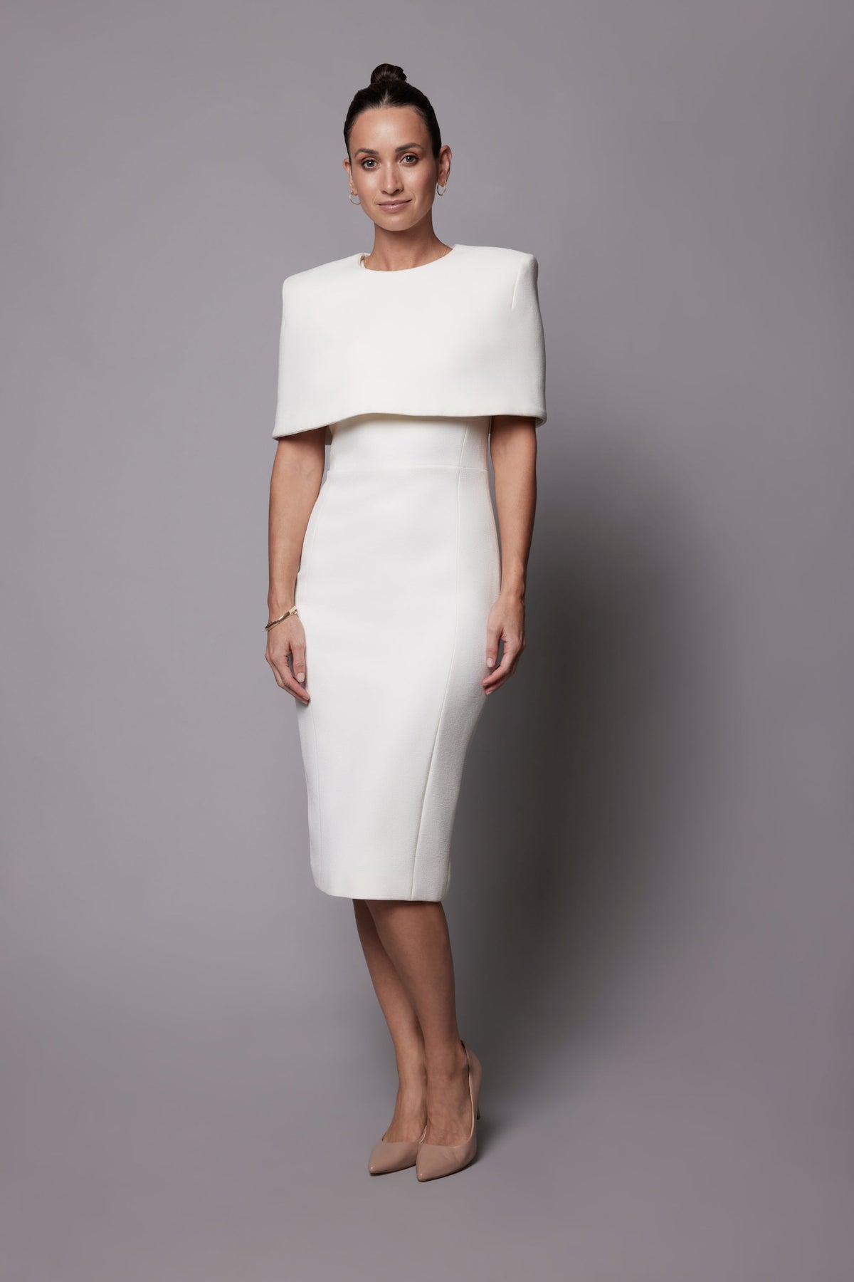 A sophisticated ivory midi dress featuring a sleek fitted silhouette with a modern structured cape overlay—minimalist yet powerful, perfect for refined occasions and elegant evenings.