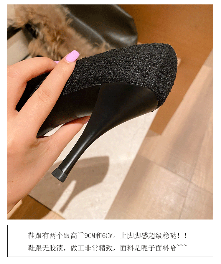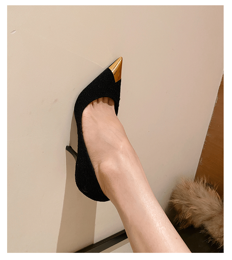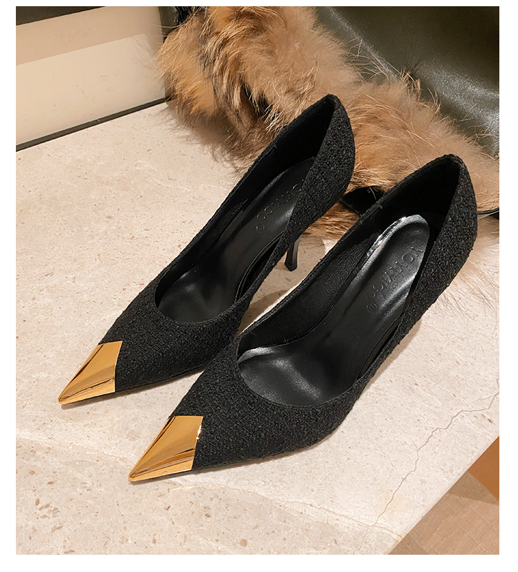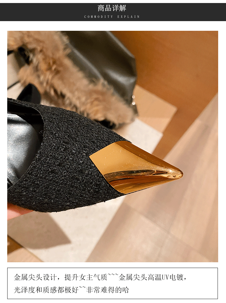 Cette élégante et sophistiquée chaussure à bout pointu est confectionnée en cuir verni noir brillant pour un look soigné. La caractéristique signature—une bordure en fourrure grise douce à l'avant—ajoute une touche luxueuse à ce design classique. Conçu avec un talon haut et élancé et une doublure douce de ton doré, ce soulier distinctif combine sans effort élégance et sophistication, que ce soit pour une tenue de soirée ou des occasions sophistiquées.