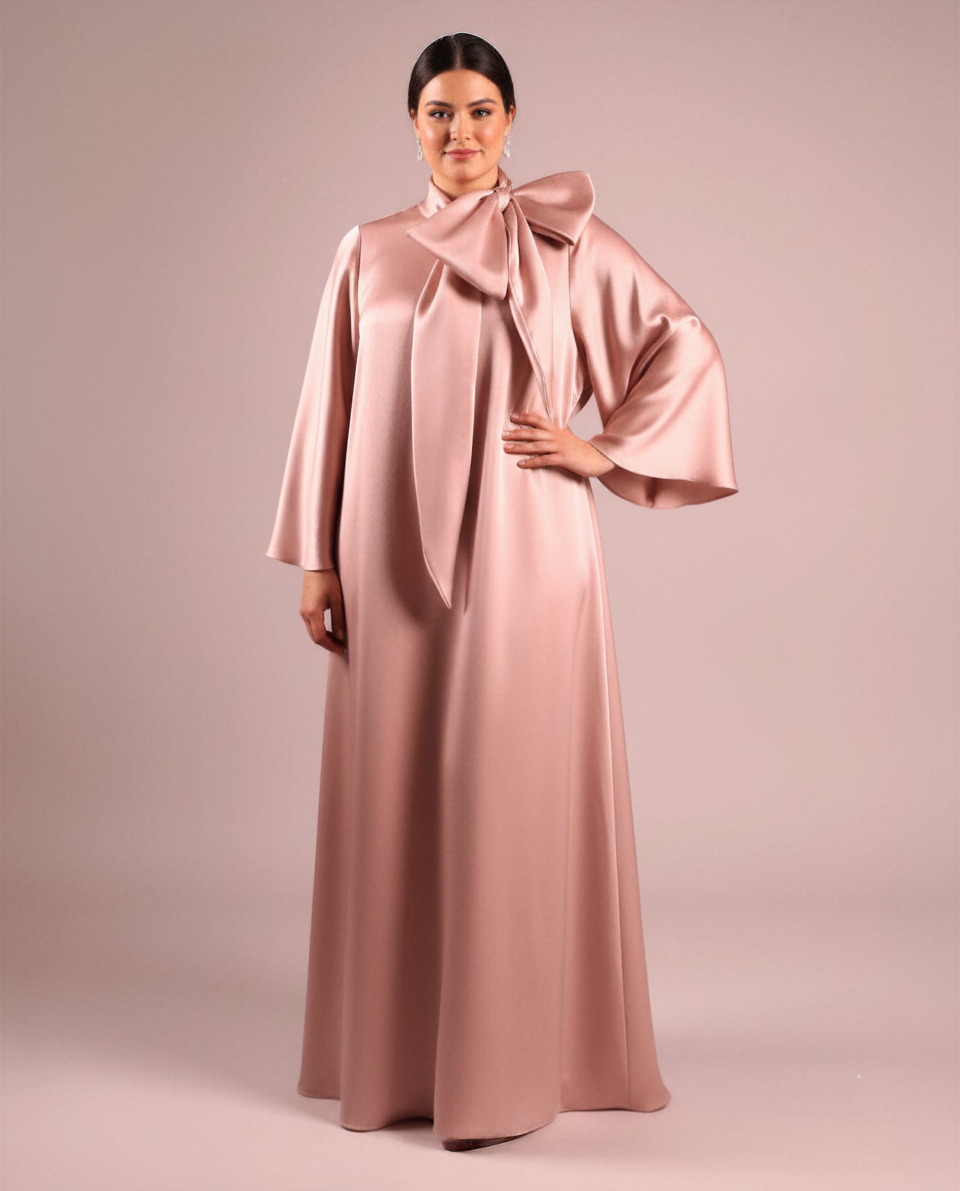 Minimalist yet statement-making, this blush pink satin gown features a high neckline adorned with an oversized sculptural bow. The loose, full-length silhouette is paired with elegant long sleeves and a soft sheen, making it perfect for formal occasions, elegant soirées, or modern modest fashion styling.