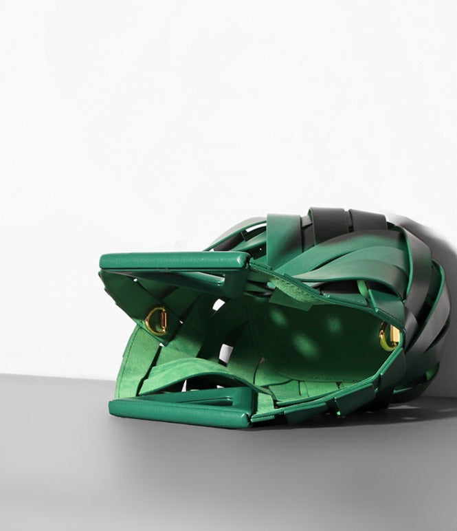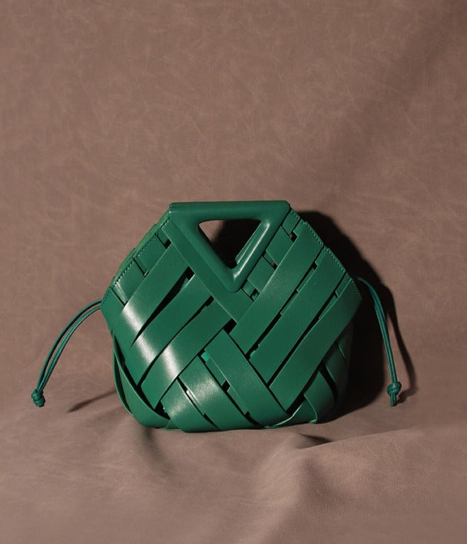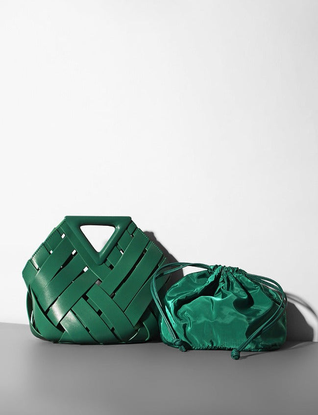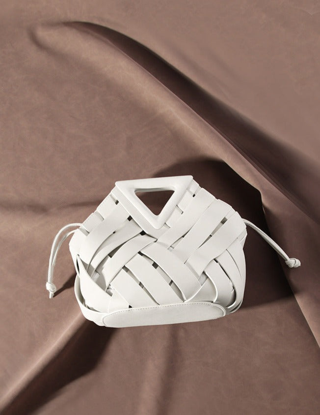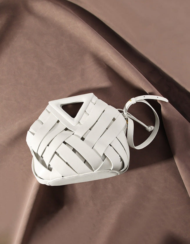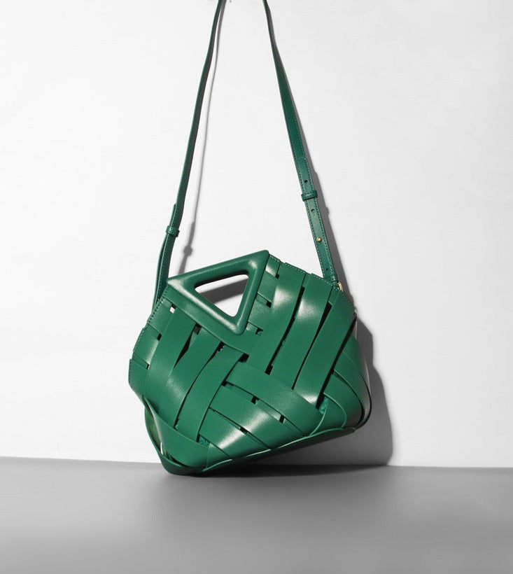 This stylish crossbody bag is crafted from wide woven leather straps, featuring a distinctive triangular handle and an adjustable side strap, offering contemporary style and everyday versatility.
