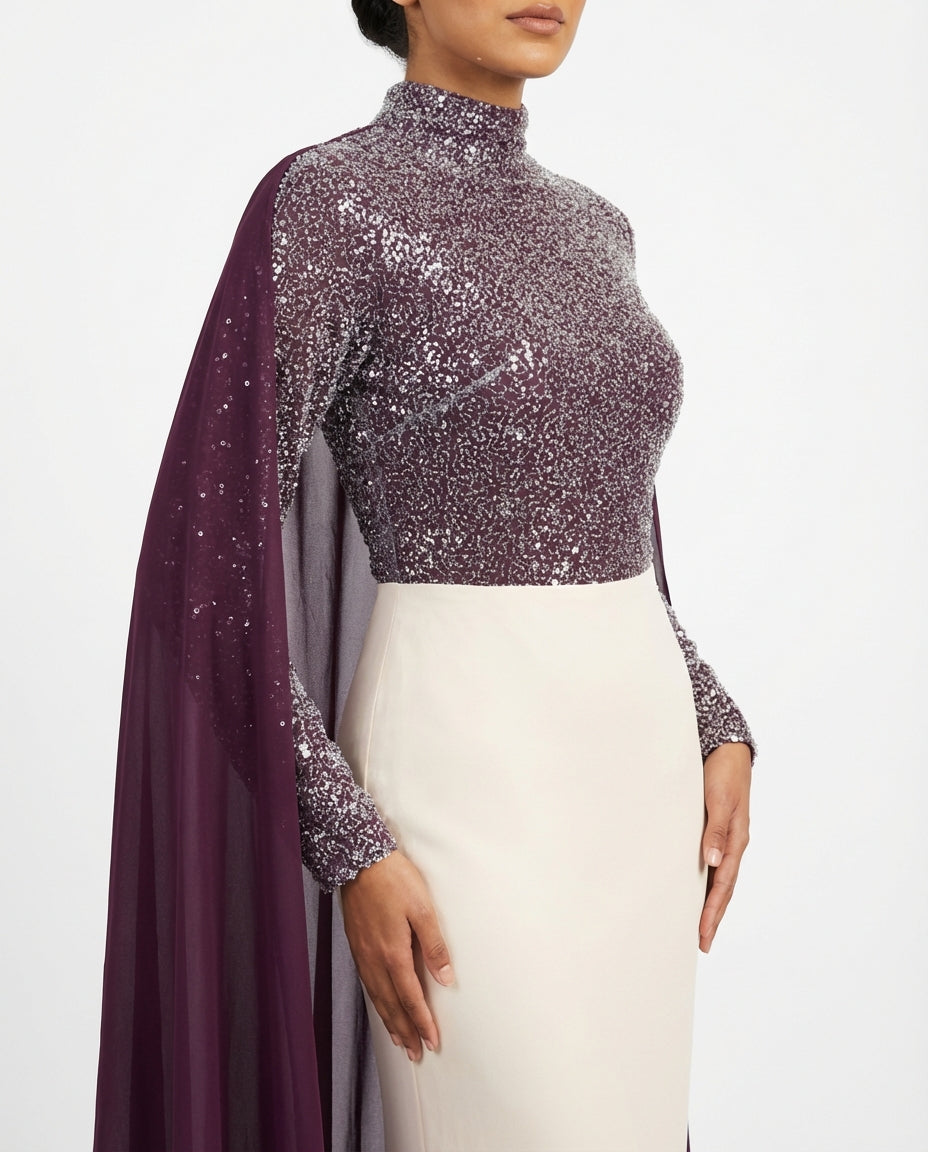 embellished high-neck maxi dress with flowing chiffon cape – ASHREF – missodd.com