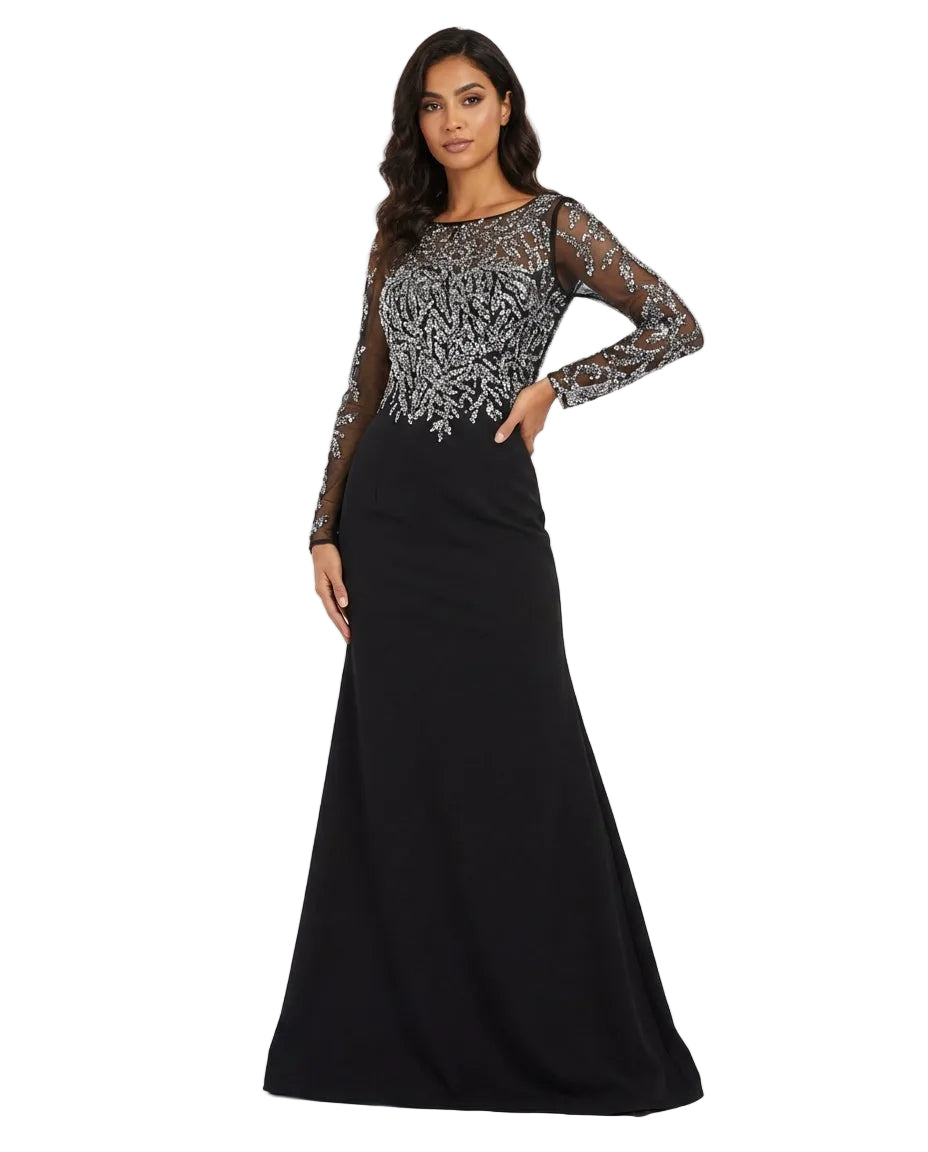 long-sleeve embellished mesh maxi dress with fitted silhouette – NOIRÉ
